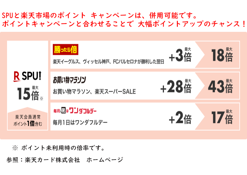 また楽天グループが運用する楽天市場を利用する場合は、ポイント還元率が1%→3%にアップし、SPU(スーパーポイントアッププログラム)を利用することで最大15%にアップします。