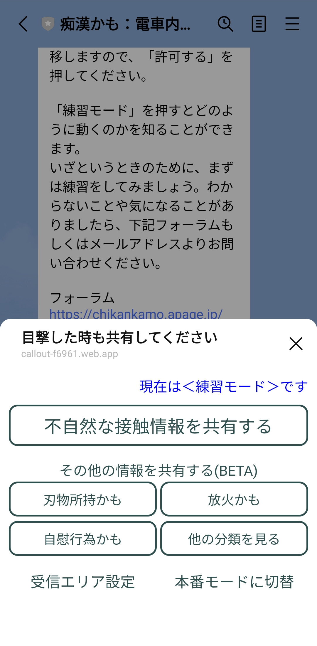 「痴漢かも:電車内<不自然な接触>情報共有」は、以下のように痴漢の防止以外にも不審者(刃物所持、放火、自慰行為など)の可能性がある場合に情報共有できるようになっています。